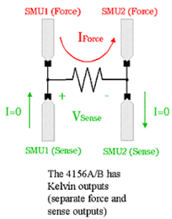 The SMU's on the 4156A can source V or I in constant mode, linear sweep mode, logarithmic sweep mode or pulsed mode. HP4156A is capable of doing Kelvin measurement which is discussed next.